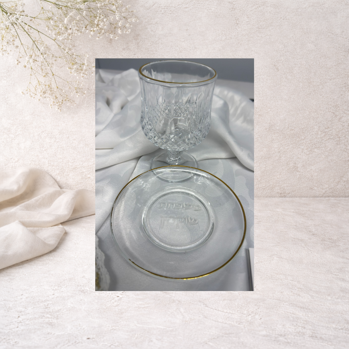 כוס קידוש מזכוכית בעיצוב אלגנטי עם עיטור זהב עדין, המעניקה לשולחן השבת והחג מראה יוקרתי ומכובד.