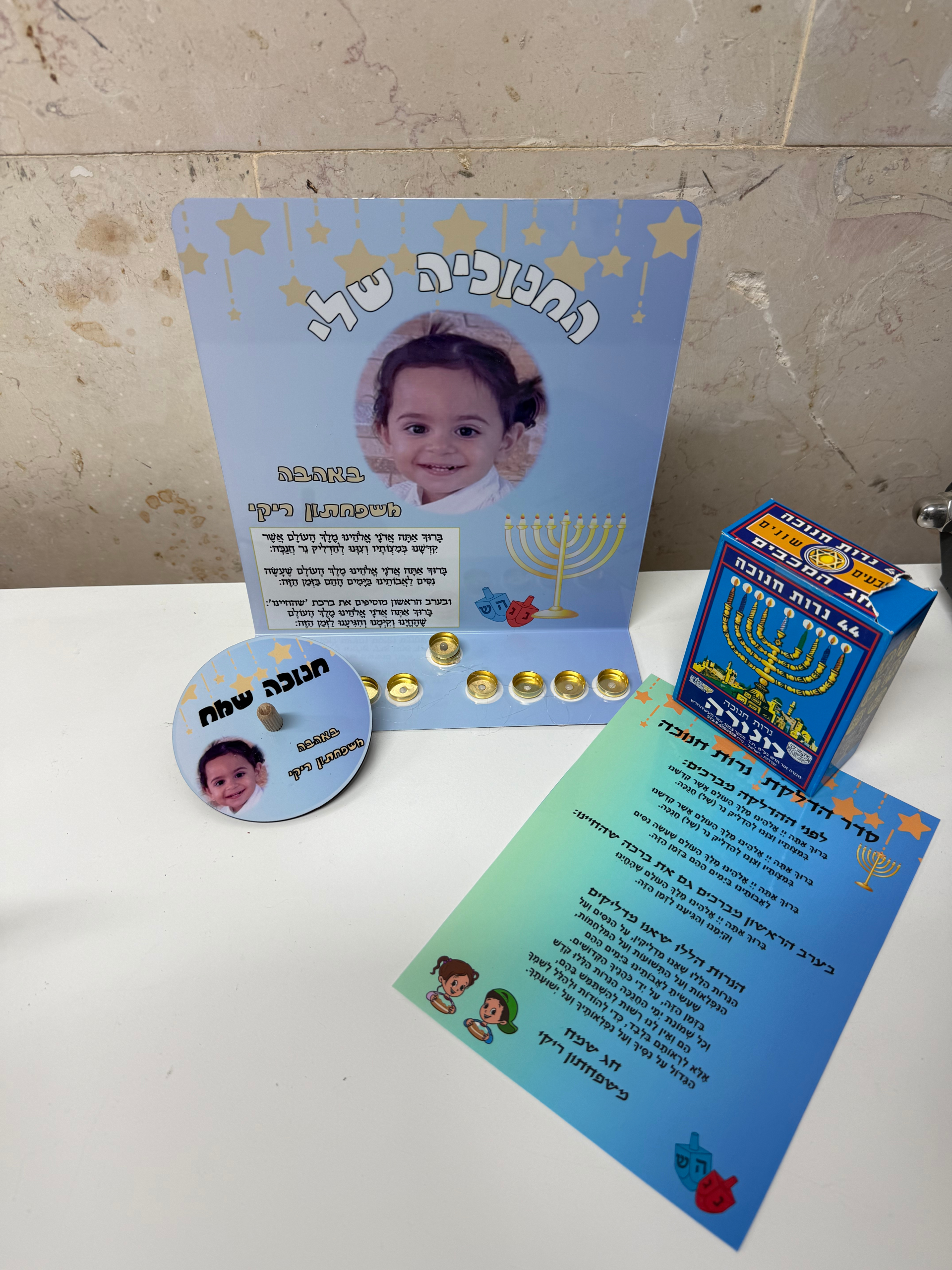ערכה חנוכיה סביבון מעץ ברכה ונרות